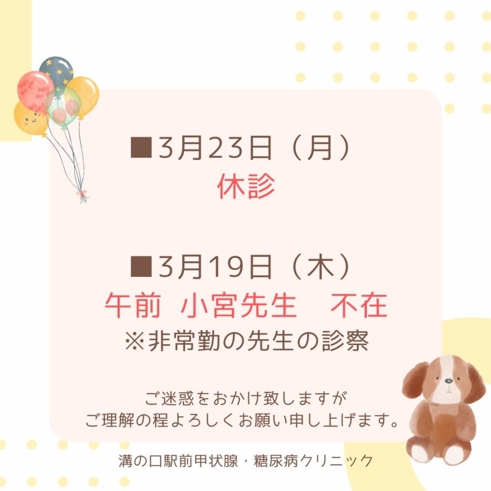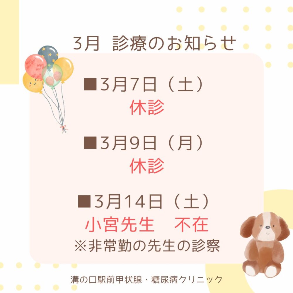 3月 診療のお知らせ 2026.02.19 新着情報 神奈川県川崎市高津区で糖尿病専門医、甲状腺専門医による 内科、代謝・内分泌内科、糖尿病内科、健康診断、ワクチン接種を行っています 溝の口駅前甲状腺・糖尿病クリニックです。 3月 診療のお知らせ